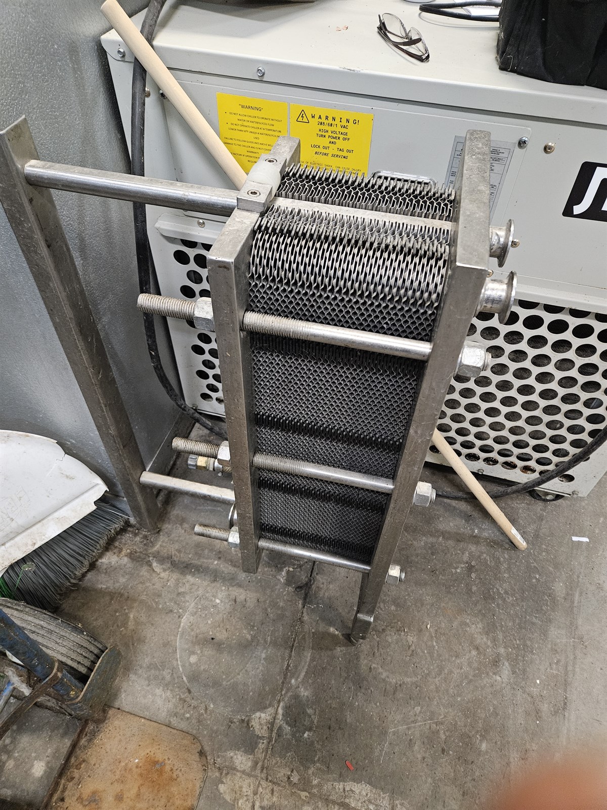 We are sell this item due to closing our brewery. Chiller was purchased used in 2018. Chiller is set up with triclamp fittings and was used to chill wort from my 5bbl brew system. Chiller works as it should and has the ability to be disassembled for deep cleaning. Not exactly sure of the make, model or manufacturer i just know it works. Comes as is.